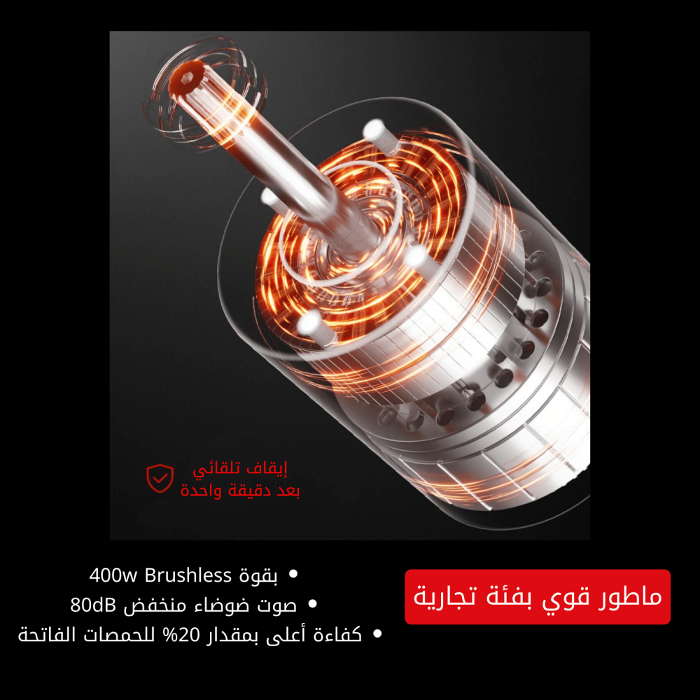- تأتي بماطور بقوة 400w ومن نوع BLDC brushless, ويعتبر مثالي للإستخدام المنزلي والتجاري أيضا حيث يزيد من كفاءة الطحن بمقدار 20% للحمصات الفاتحة وحبات القهوة القاسية, وأيضا يمنع التعليق للقهوة في السرعات العالية.